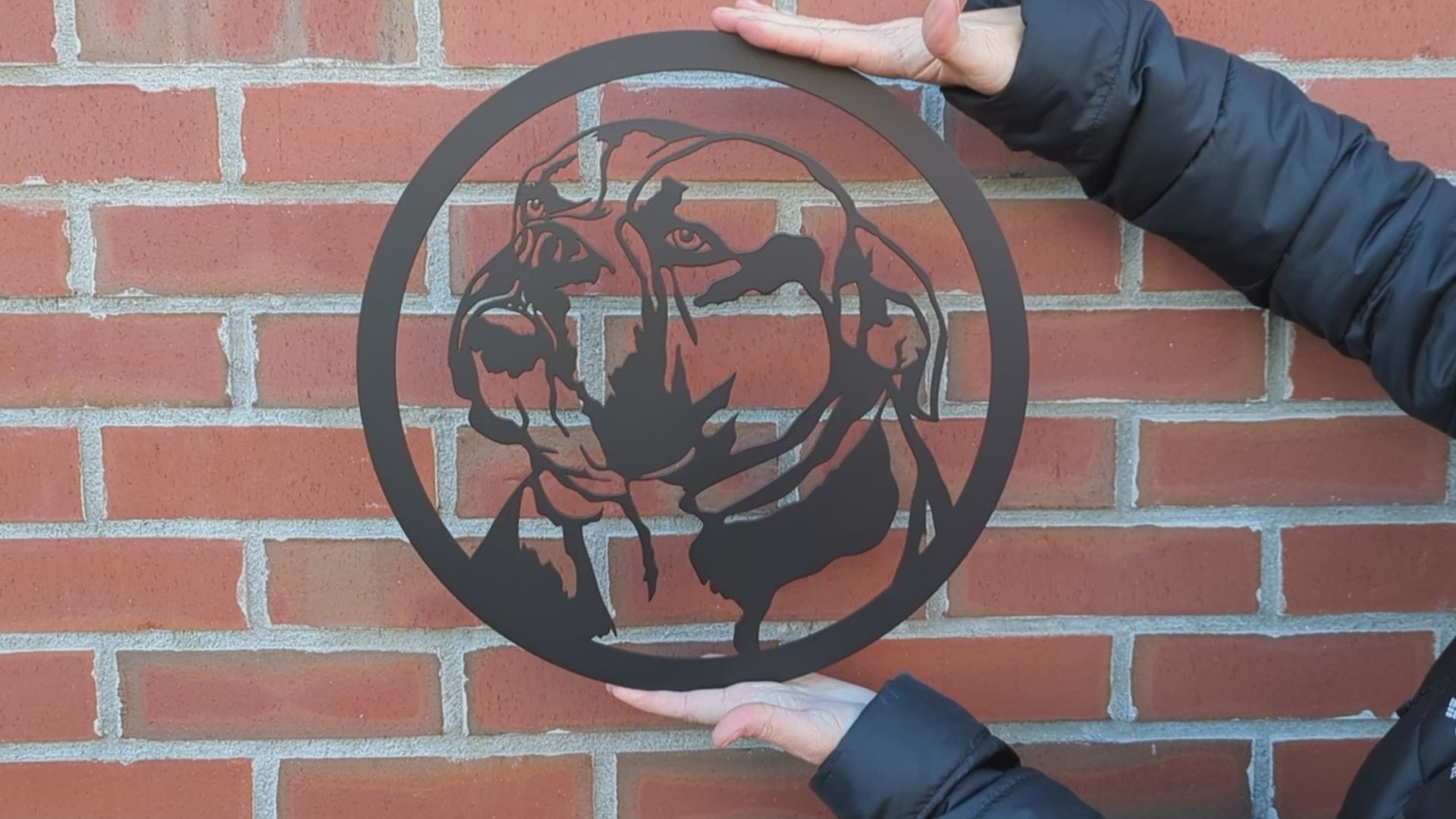 The English Bulldog is certainly an iconic breed. This mastiff type breed is medium sized with a rather large head and distinctive thick folds of skin around the face and shoulders. Their broad, flat face and unforgettable underbite have all been captured in our take on the English Bulldog.  Our laser is able to cut the beautiful details from the 16 gauge cold rolled steel that we use to ensure this sign is sturdy, yet not too heavy, to be easily hung on your wall. We weld our rear hanger on this to make it simple to hang wherever you prefer, and the powder coat finish provides weather and rust resistance allowing this sign to be hung indoors or outdoors. We offer this sign in multiple sizes.