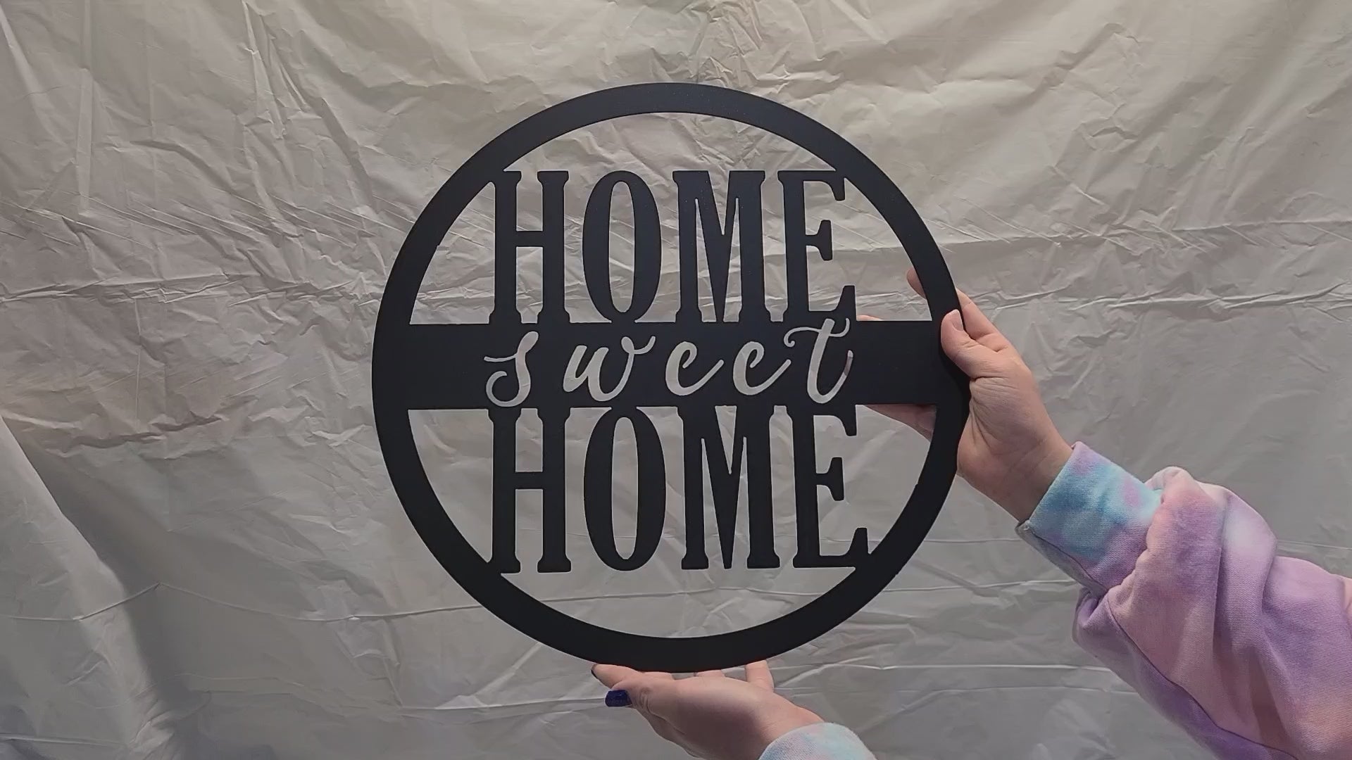 This beautiful metal Home Sweet Home sign is perfect for any wall or door and is sure to get attention anywhere you hang it. What an elegant and fun way to welcome friends and family into your home with a special script font. We cut this sign from 16 gauge cold rolled steel for quality construction, but without being too heavy to hang on your wall. We apply a powder coat finish for beauty and durability allowing this sign to be hung indoors or outdoors. Hanging this is quick and simple with our welded-on rear bracket.